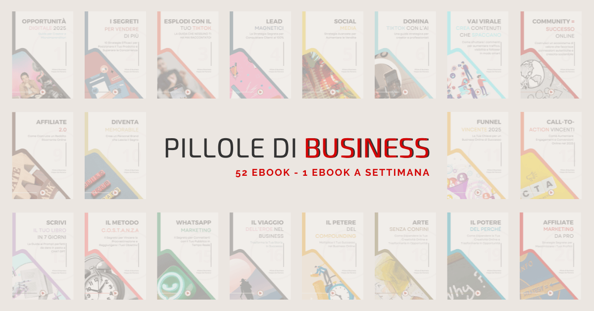 Ho creato 52 ebook, ognuno ricco di strategie e consigli pratici per aiutarti a far crescere il tuo business, migliorare la tua produttività e potenziare le tue competenze digitali.